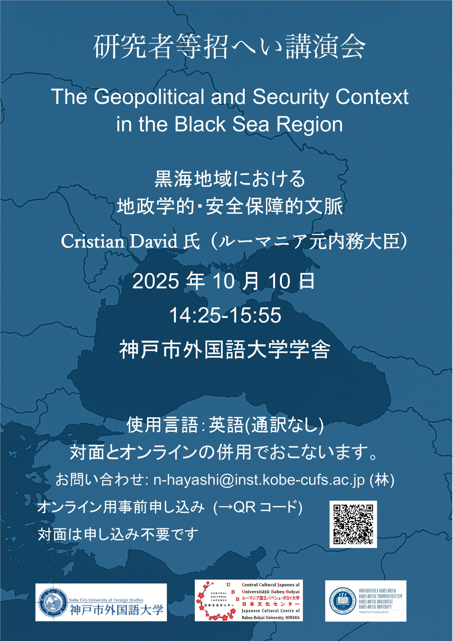 În data de 10 oct. 2025, fostul ministru al Afacerilor Interne al României, dl Cristian David, a ținut în o prelegere intitulată „The Geopolitical and Security Context in the Black Sea Region”. Prezentarea a avut loc în mod hibrid la Kobe City University of Foreign Studies (KCUFS) cu sprijinul CCJUBB și prin intermediul Ambasadei Japoniei în România. KCUFS este o universitate din Japonia la care Institutul Cultural Român organizează cursuri de limba română în colaborare cu CCJUBB. Ne bucurăm de vizita dlui David la KCUFS și de faptul că prin aceasta oportunitate se întărește legătura dintre România și Japonia.