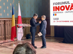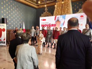 2025年10月23日、CCJUBBのメンバー(角悠介、瓦愛都、アンヌ・マリー・ロイヨ、ノエミ・セープ、ガブリエル・ルス、大坂海希)はヤシ市で開催された政府間行事「第3回ルーマニア・日本イノベーションフォーラム」に参加しました。文化宮殿にて行われた開会式では、ルーマニア国立オペラ所属の瓦愛都による日本国家独唱が披露されました。また、日本におけるルーマニア語教育の普及に貢献した鈴木信五先生のヤシ市名誉市民号の授与式が行われました(角悠介による推薦)。